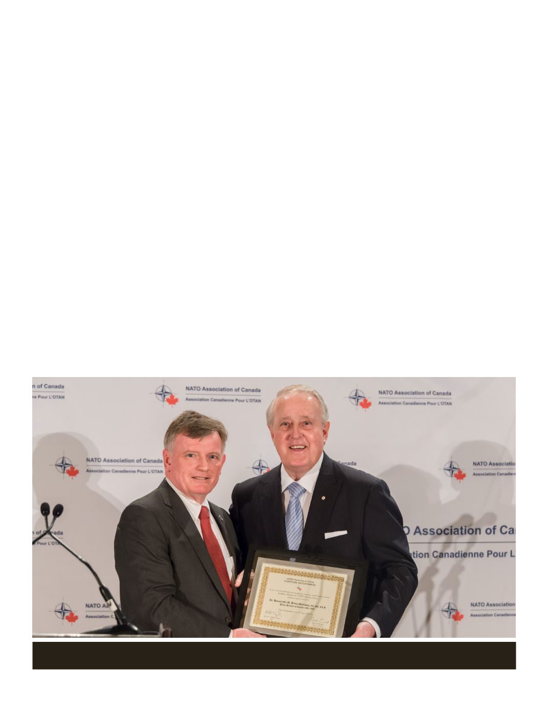 Hon. David Pratt presenting Rt. Hon. Brian Mulroney with an award for a lifetime
